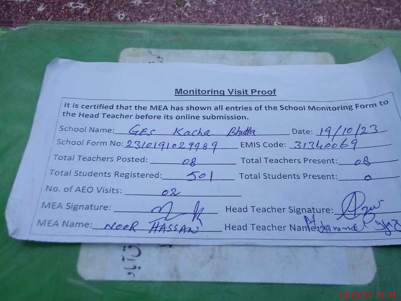 | Attendance Register | Head Teacher | MEA with School | Visit Proof |