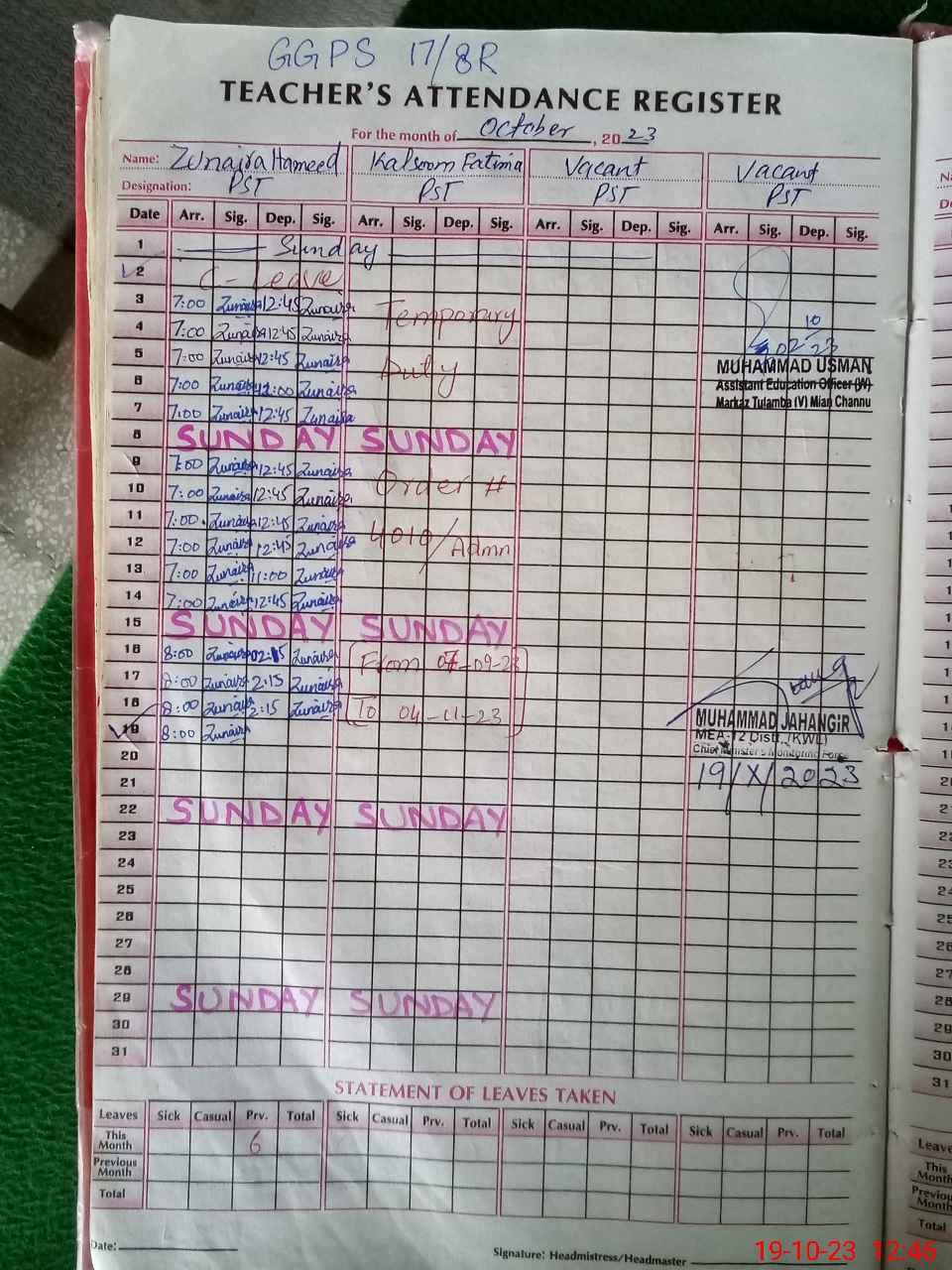 | Remarks (Use Separate Page if Required): THIS SCHOOL IS INSAF AFTERNOON SCHOOL FTF RECORDS IS NOT MAINTAINED THREE TOILETS FOUND BLOCKED AND NON FUNCTIONAL TODAY STUDENTS ARE NOT PRESENT IN THE SCHOOL LESSON PLANS ARE NOT AVAILABLE KALSOOM FATIMA PST TEMPORARY DUTY NEED BASE OR TILL THE COMPLETION OF ASSIGNMENT IS NOT JUSTIFIED SO SAID TEACHER FOUND UN AUTHORISED AFTERNOON STUDENTS ATTENDANCE UPTO 12 OCTOBER 2023 ARE MARKED AFTER THIS COLUMNS WERE LEFT BLANK AFTERNOON TEACHING STAFF ATTENDANCE UPTO 17 OCTOBER 2023 ARE MARKED AFTER THIS NO ATTENDANCE AND COLUMNS WERE LEFT BLANK | |||||