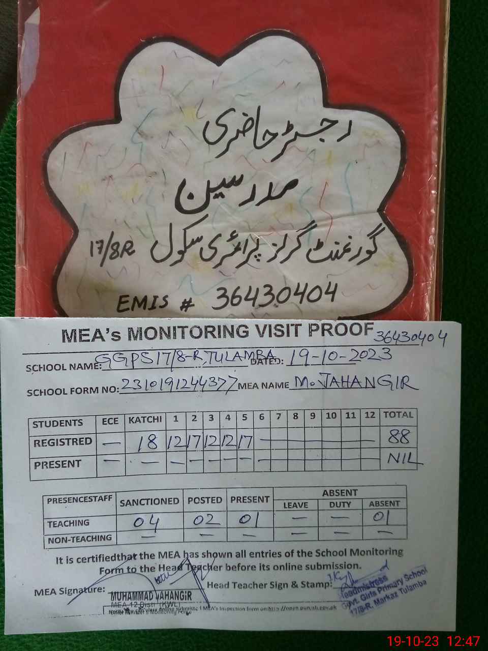 | Attendance Register | Head Teacher | MEA with School | Visit Proof |