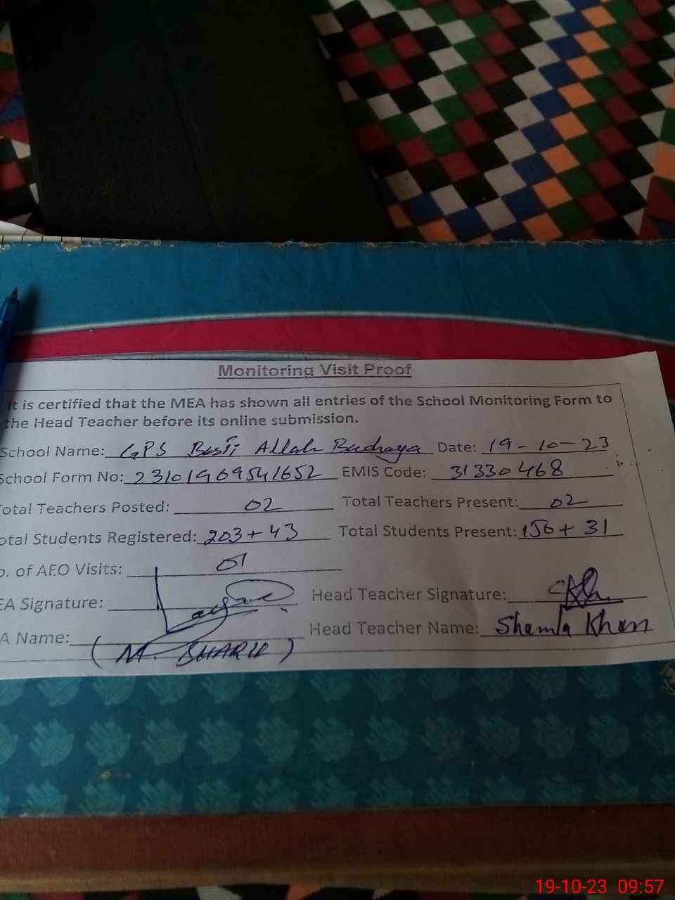 | Attendance Register | Head Teacher | MEA with School | Visit Proof |