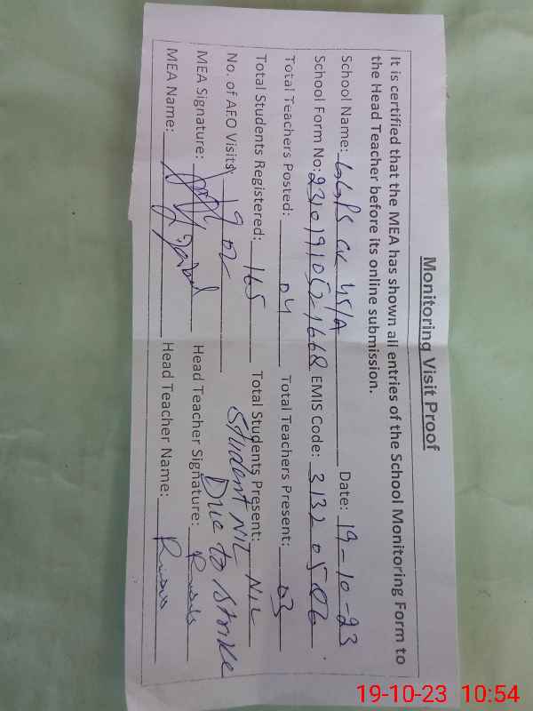 | Attendance Register | Head Teacher | MEA with School | Visit Proof |
