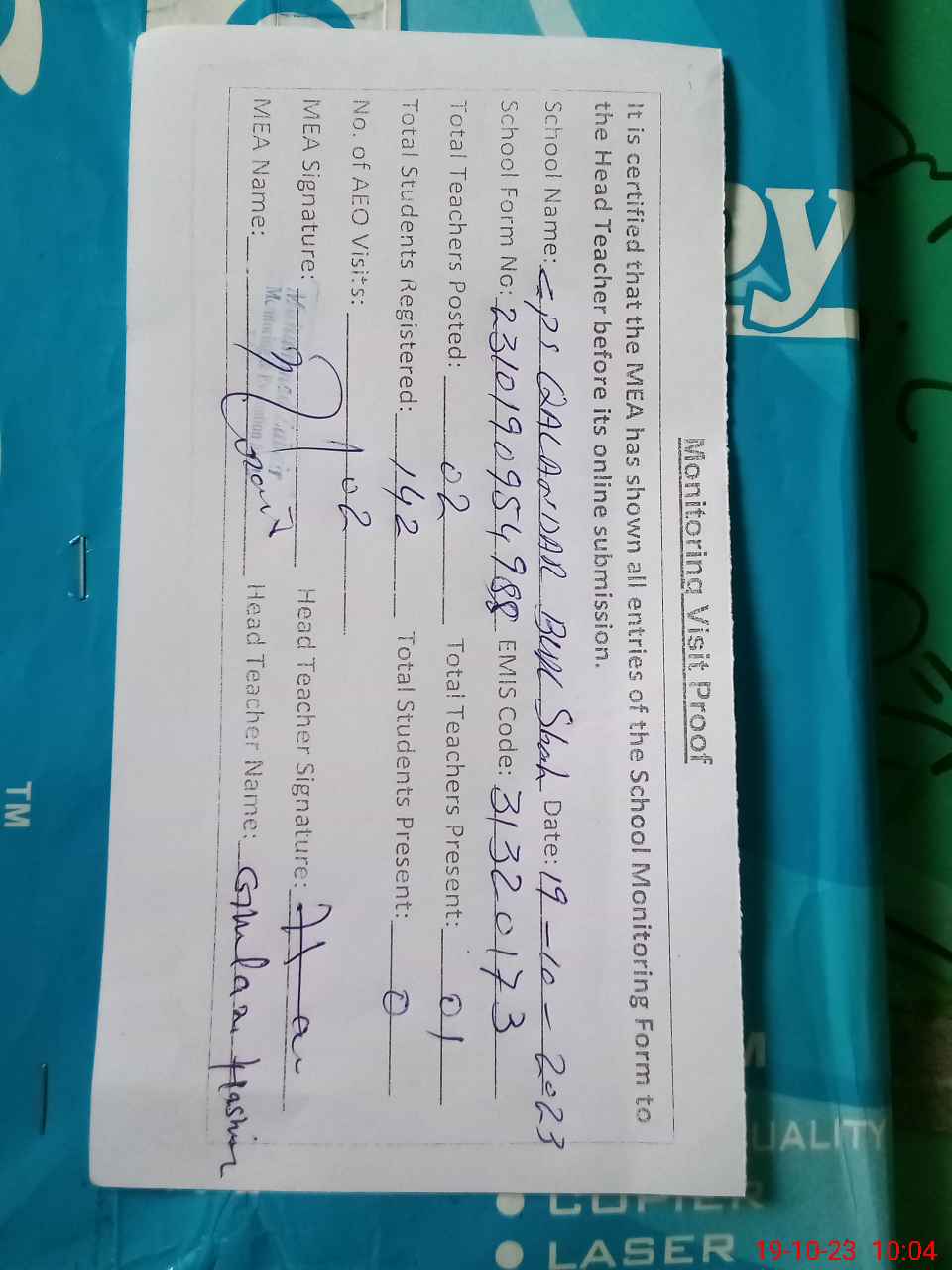| Attendance Register | Head Teacher | MEA with School | Visit Proof |