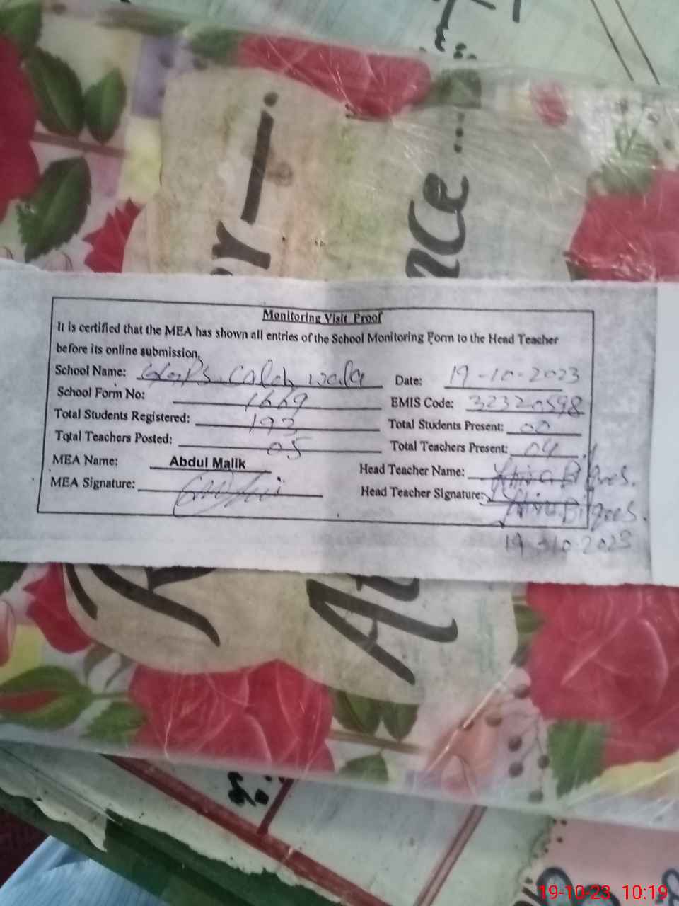 | Certified that this School was Inspected by the Undersigned MEA/DMO Today and the Information Stated Above is as Per Record. | |||||