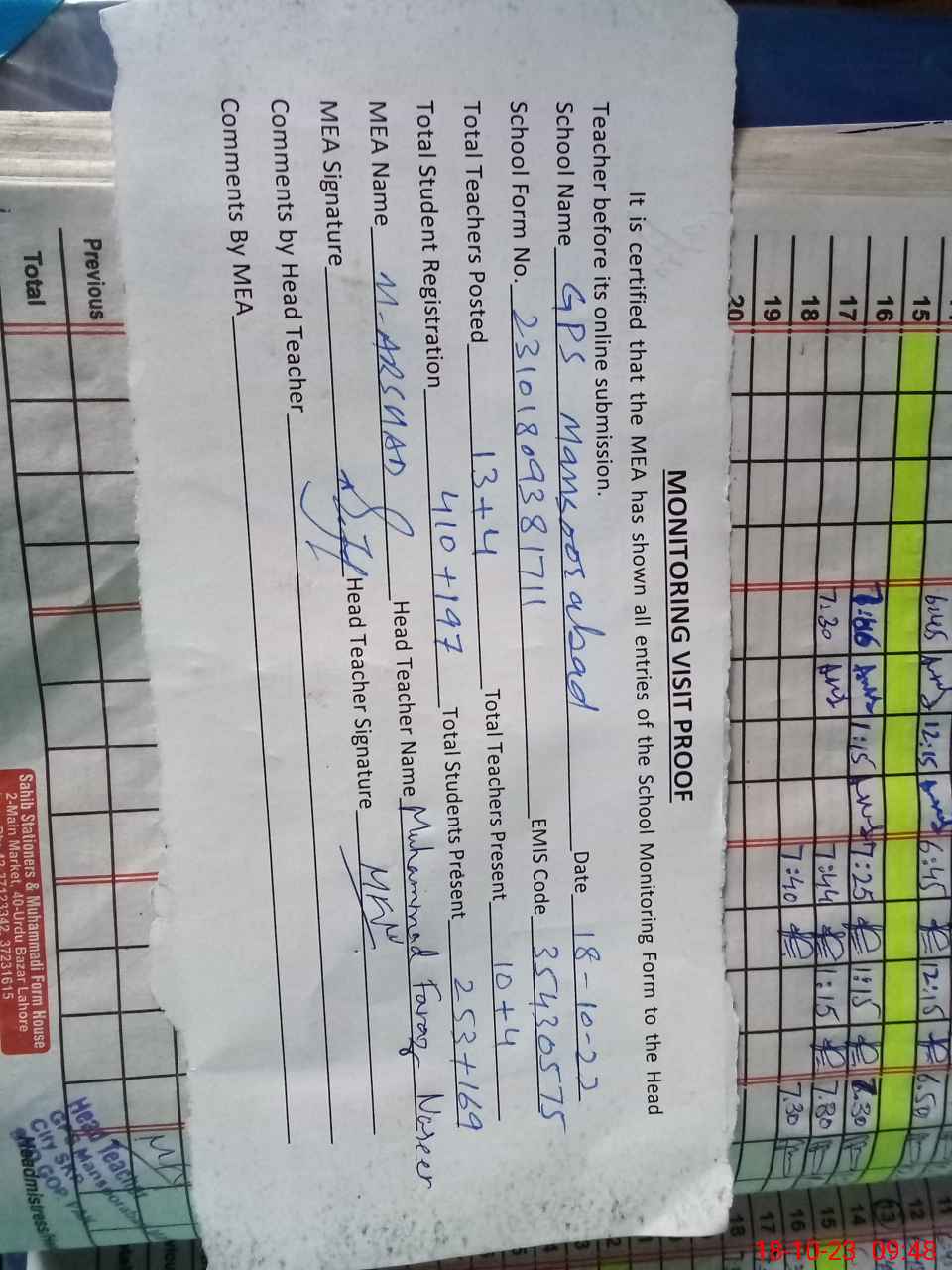 | Attendance Register | Head Teacher | MEA with School | Visit Proof |