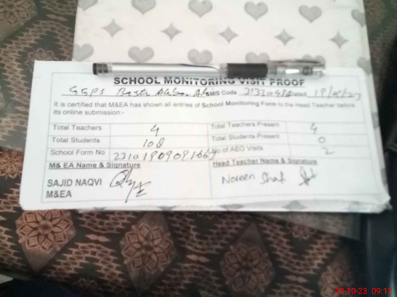 | Attendance Register | Head Teacher | MEA with School | Visit Proof |