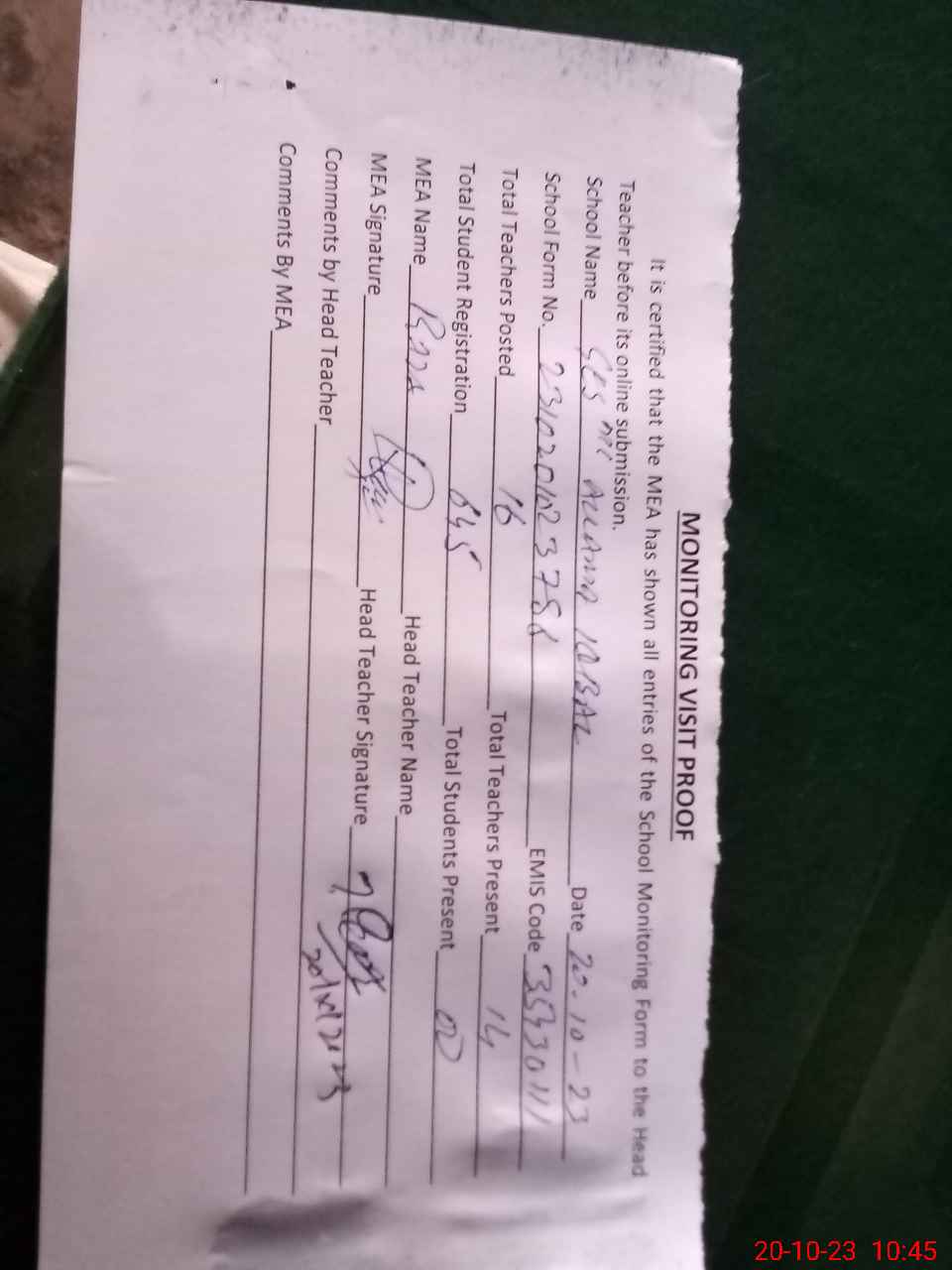| Attendance Register | Head Teacher | MEA with School | Visit Proof |
