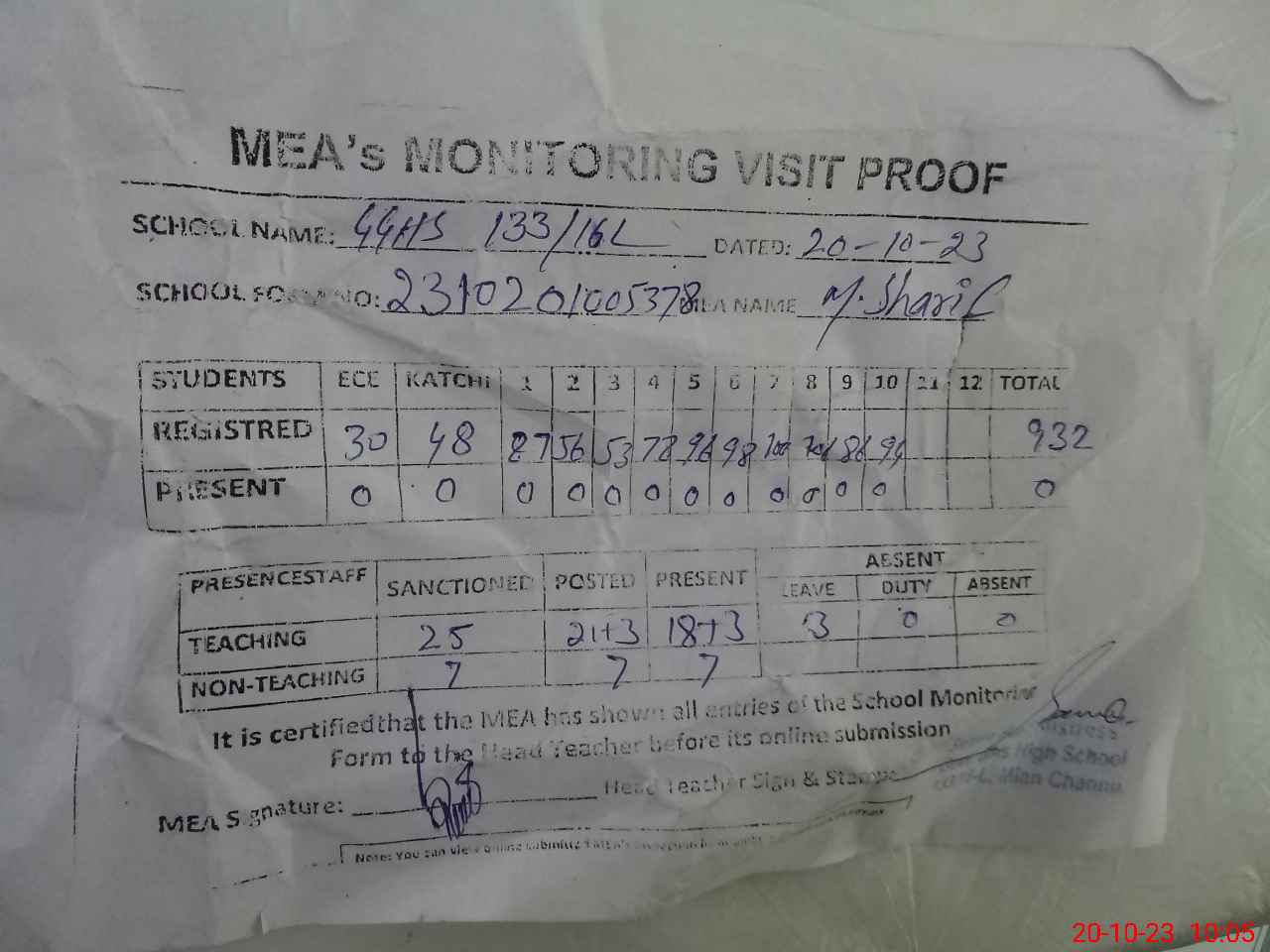 | EMIS Code: 36430041 | Name of School: GGHS 133/16-L, MIAN CHANNU | |||