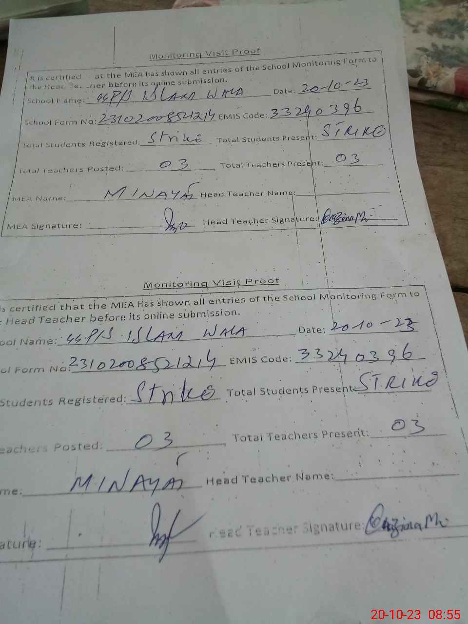 | Attendance Register | Head Teacher | MEA with School | Visit Proof |