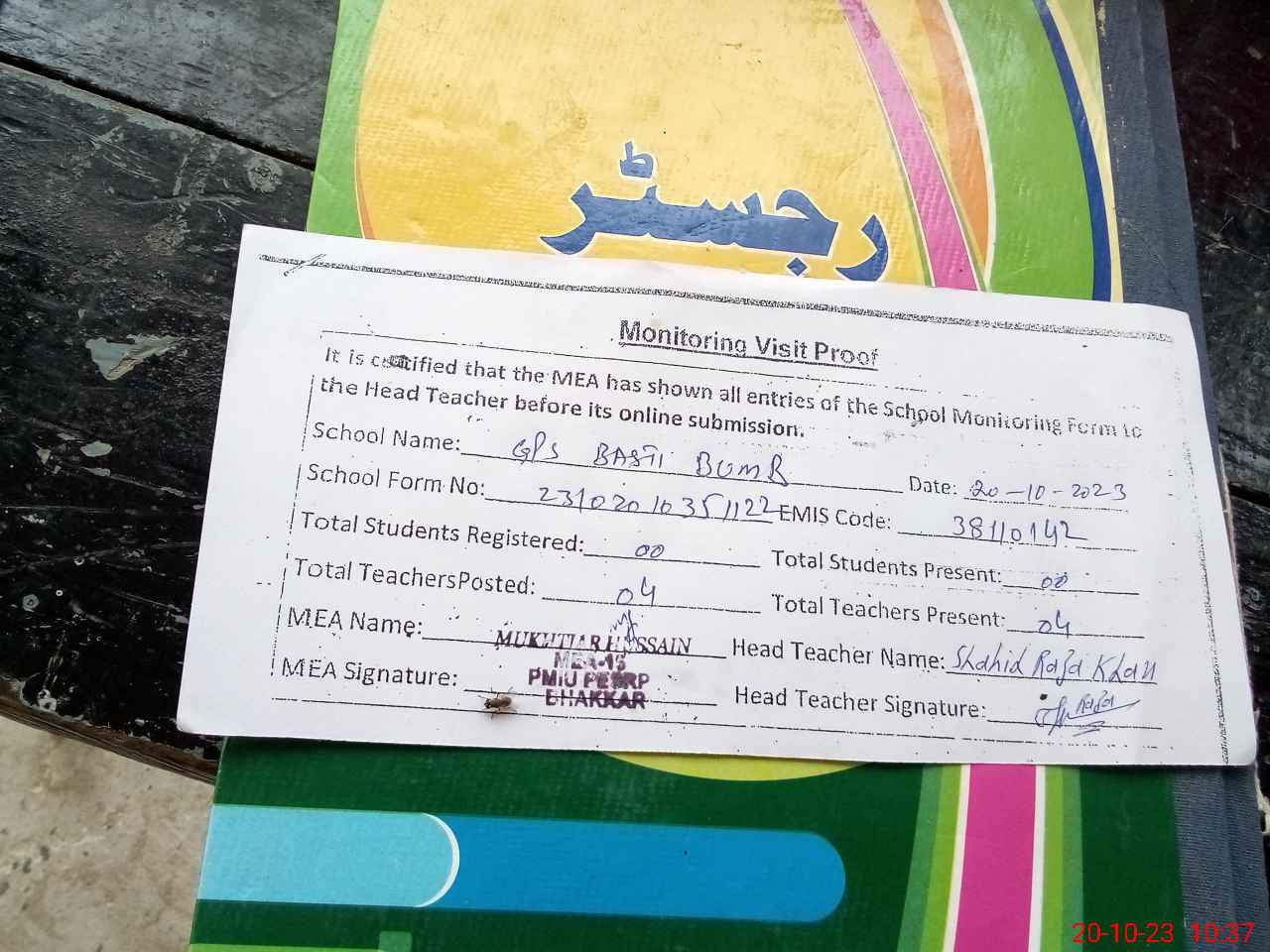 | EMIS Code: 38110142 | Name of School: GPS BASTI BUMB | |||