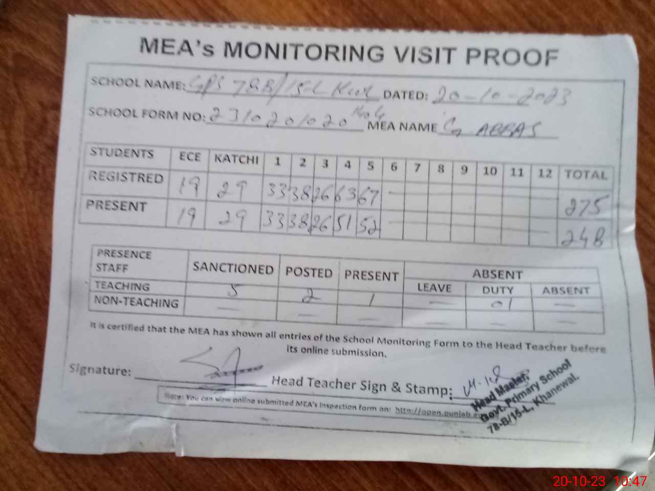 | Attendance Register | Head Teacher | MEA with School | Visit Proof |