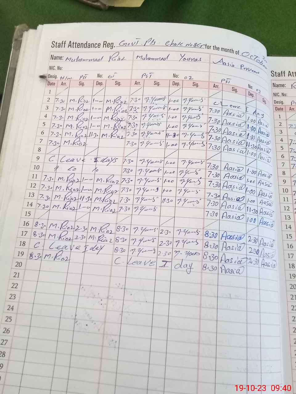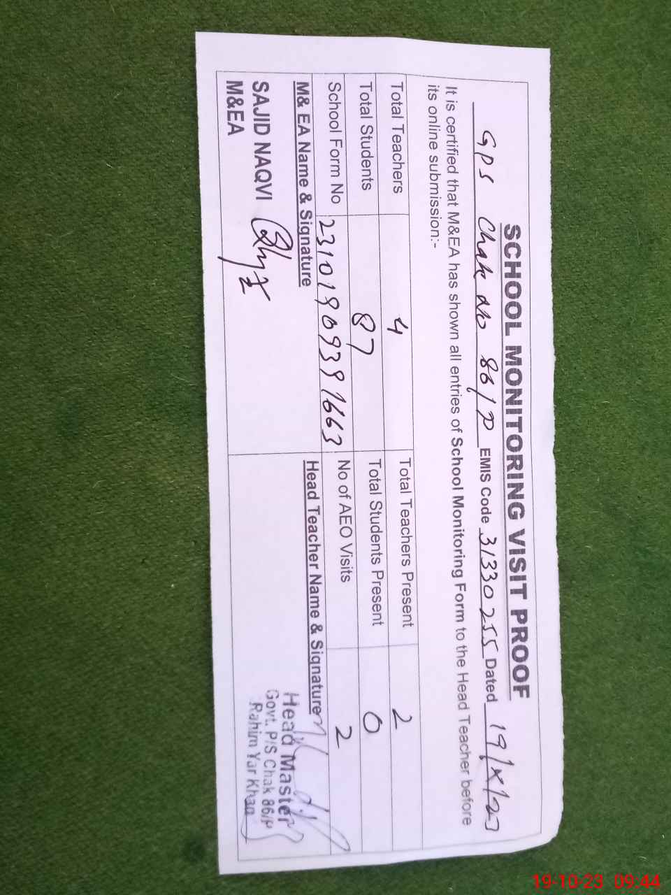 | Name: MO**** RI**** Designation: (School Headmaster's/Headmistress's) PST Phone/Cell Number: 03**** |