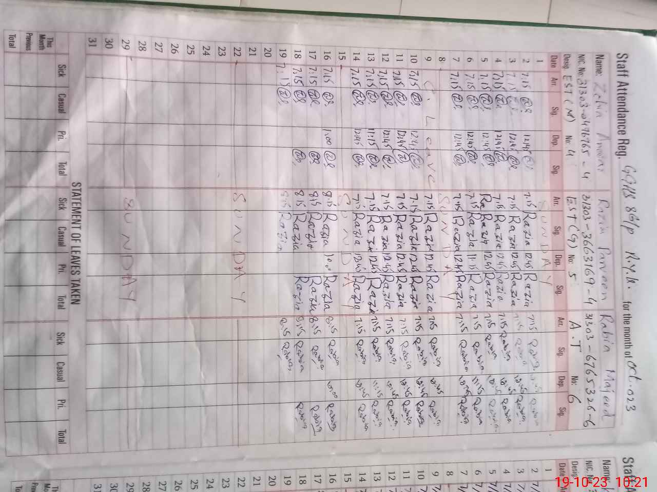 | CNIC | Full Name | Designation | R/C | Absence During Last Calender Month |
