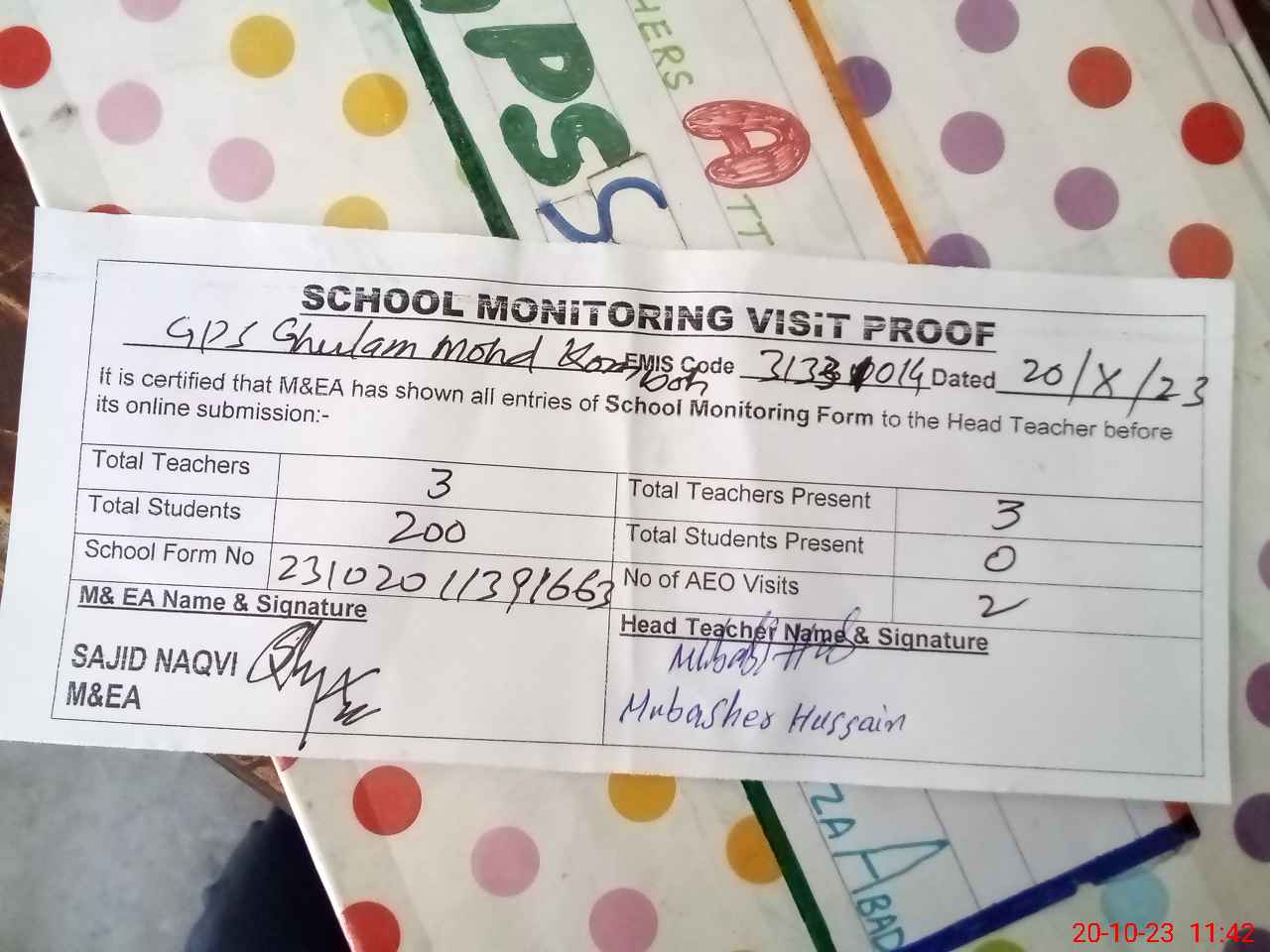| EMIS Code: 31331014 | Name of School: GPS GHULAM MUHAMMAD KOMBOO | |||