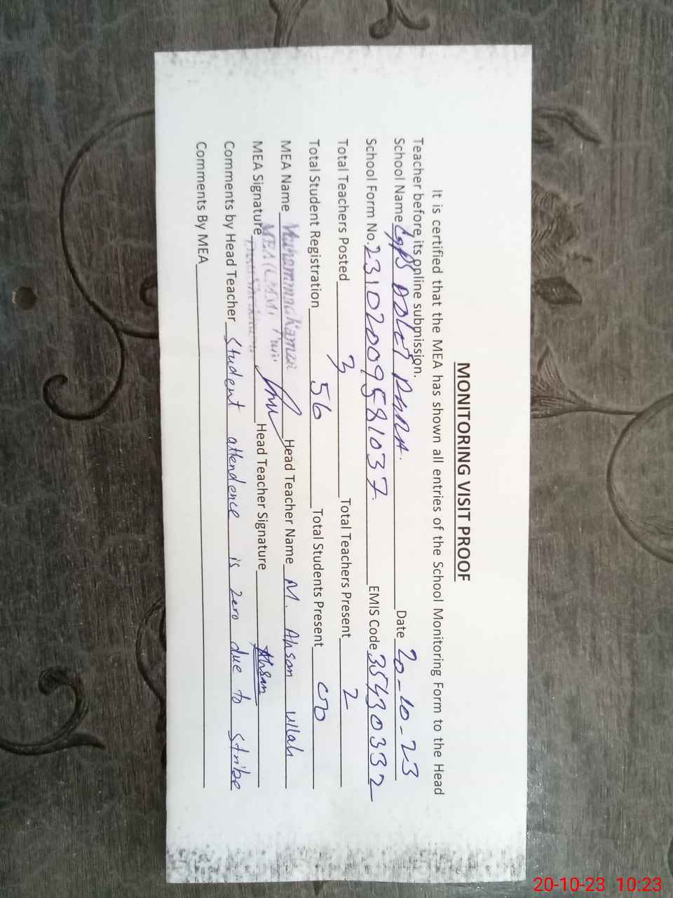 | Attendance Register | Head Teacher | MEA with School | Visit Proof |