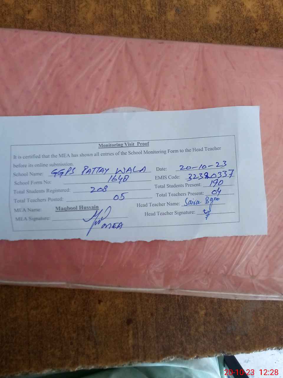 | Attendance Register | Head Teacher | MEA with School | Visit Proof |