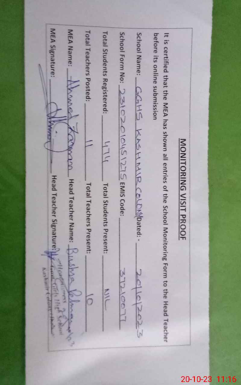 | EMIS Code: 37210077 | Name of School: GGHS KASHMIR COLONY | |||