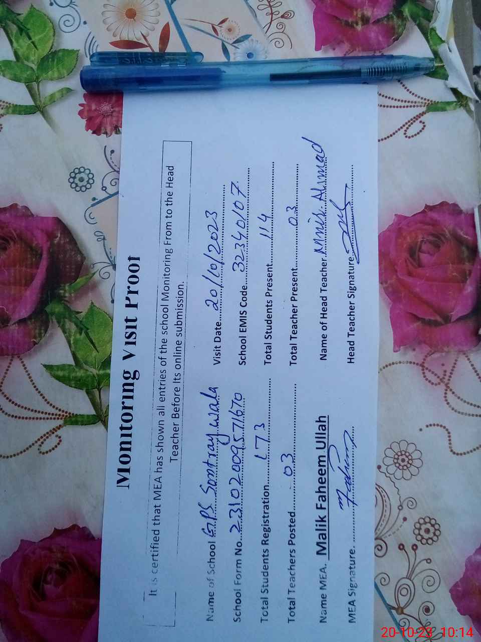 | Attendance Register | Head Teacher | MEA with School | Visit Proof |