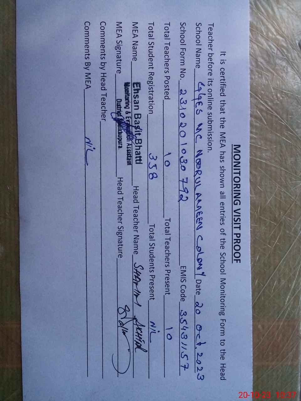 | Attendance Register | Head Teacher | MEA with School | Visit Proof |