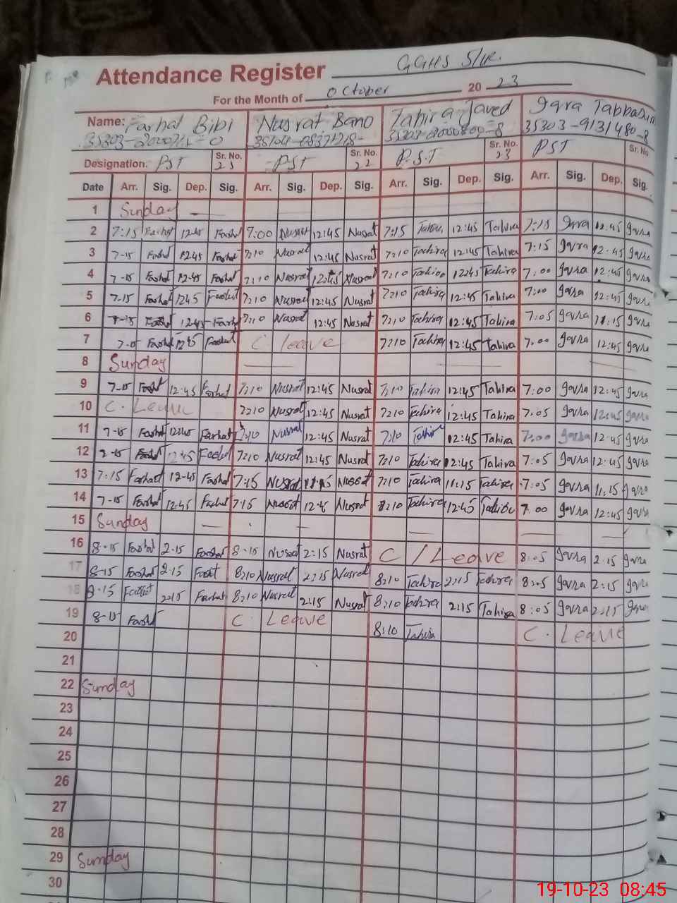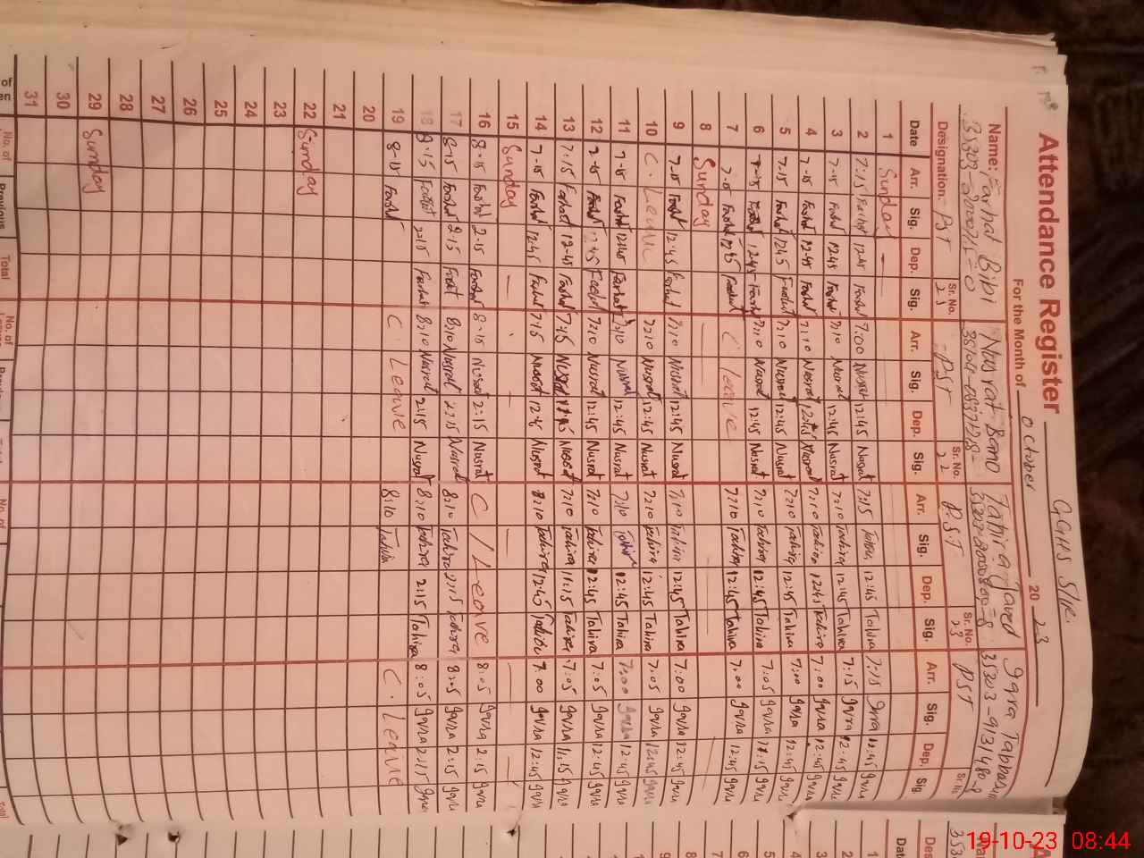 | CNIC | Full Name | Designation | R/C | Absence During Last Calender Month |