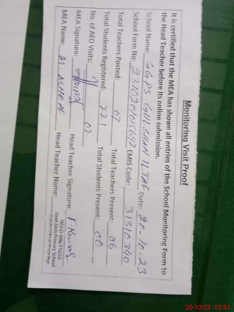 | Attendance Register | Head Teacher | MEA with School | Visit Proof |