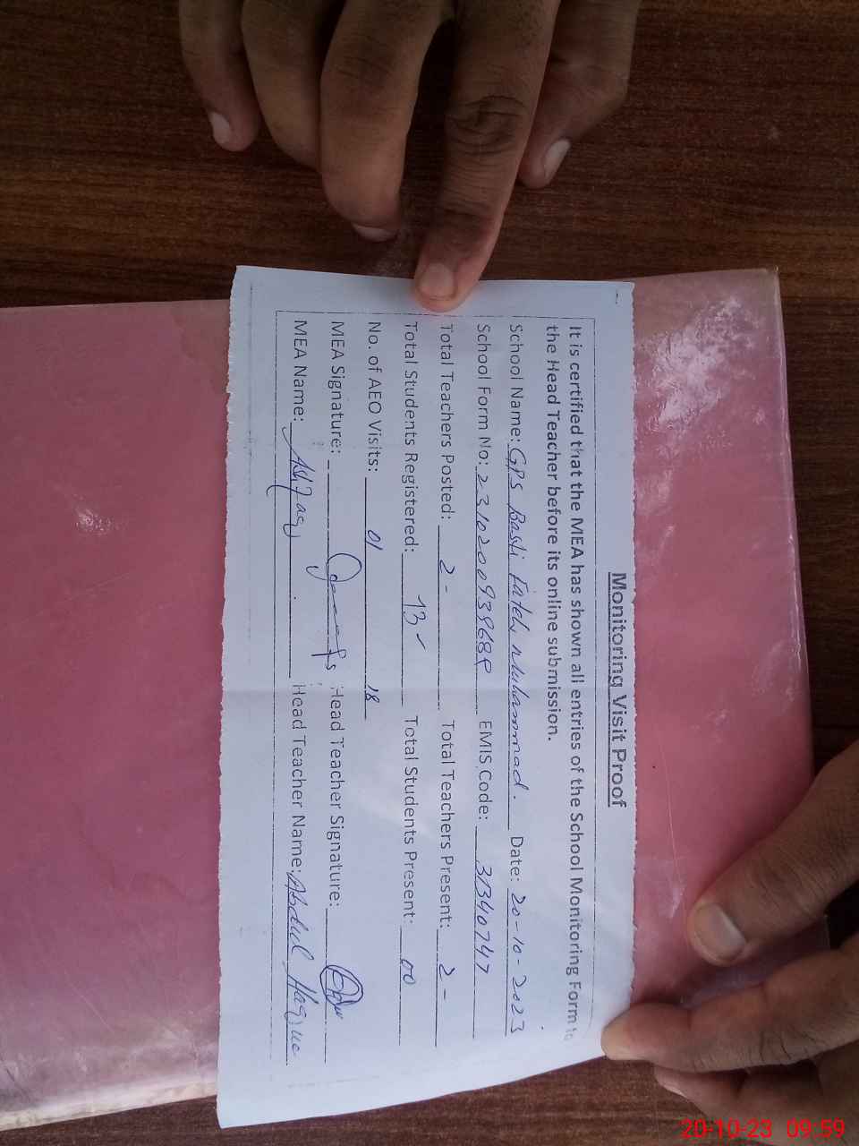 | Attendance Register | Head Teacher | MEA with School | Visit Proof |