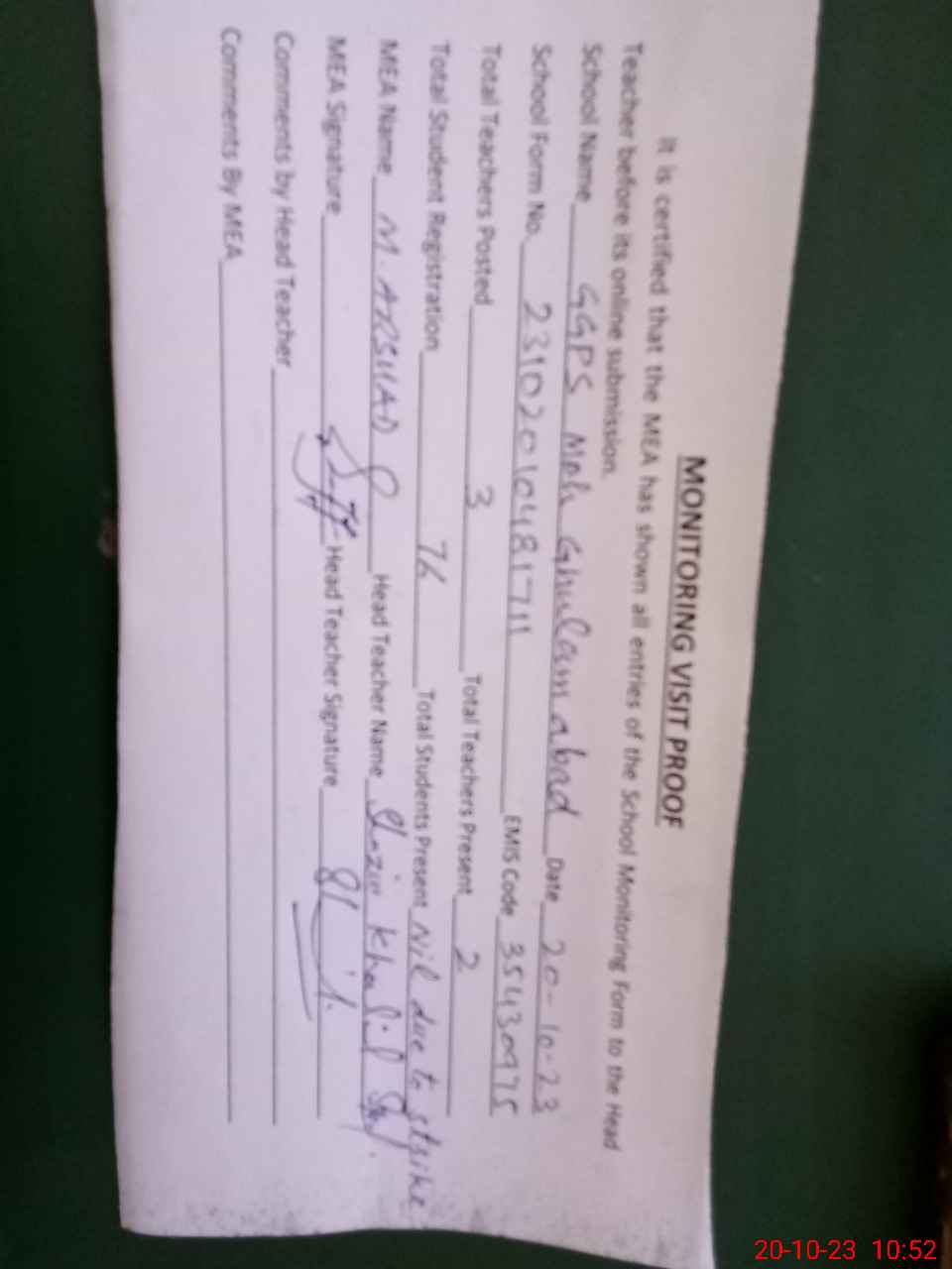 | Attendance Register | Head Teacher | MEA with School | Visit Proof |