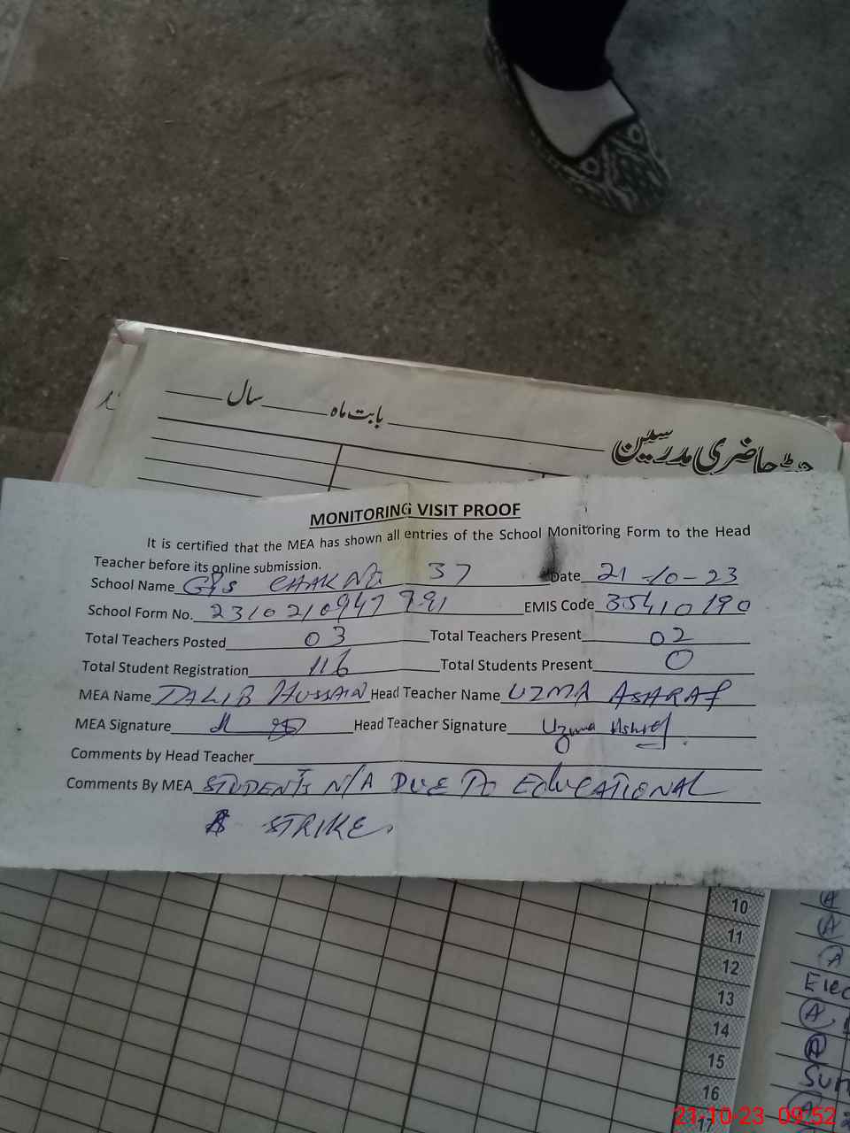 | Attendance Register | Head Teacher | MEA with School | Visit Proof |