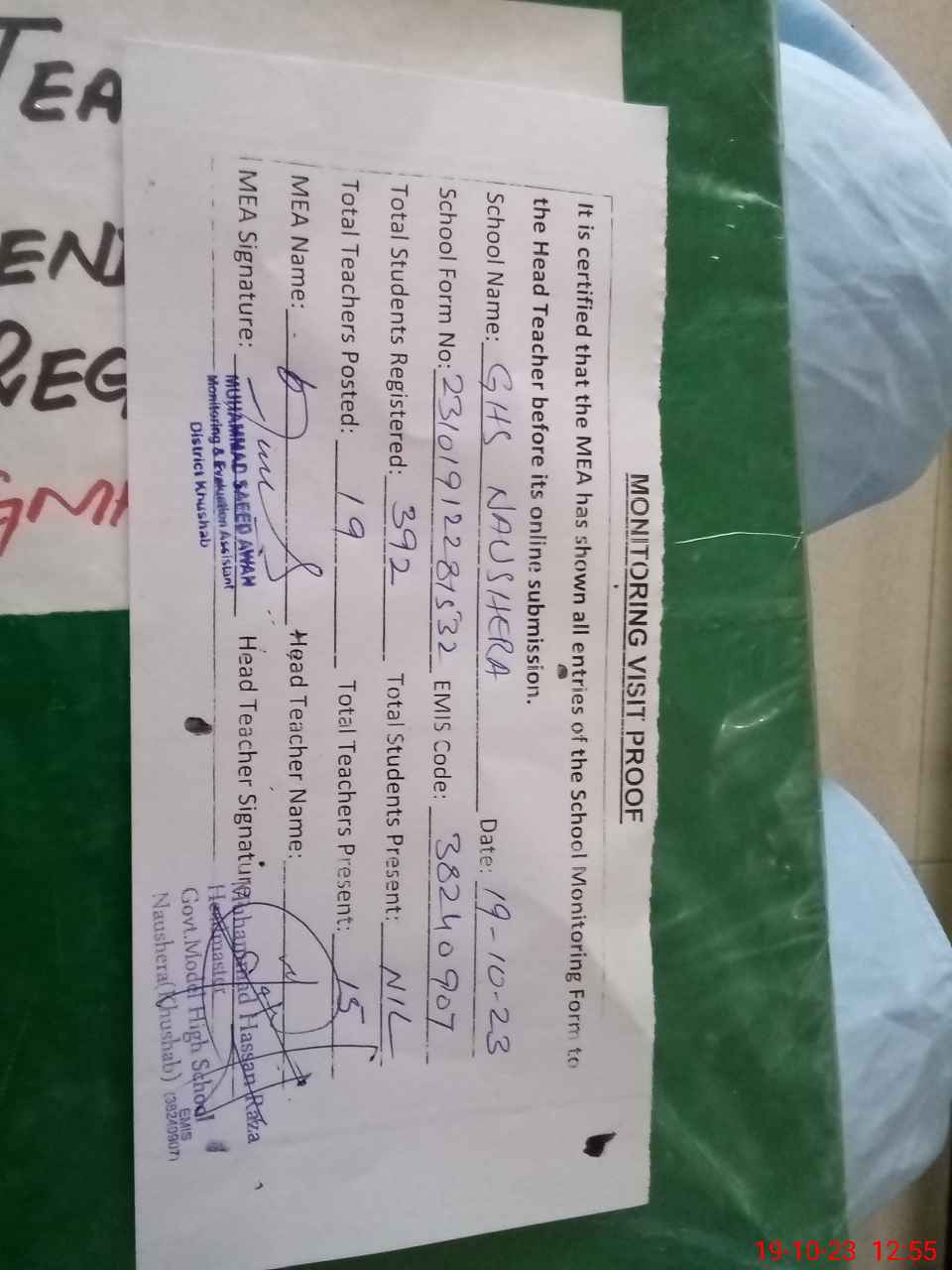 | Certified that this School was Inspected by the Undersigned MEA/DMO Today and the Information Stated Above is as Per Record. | |||||