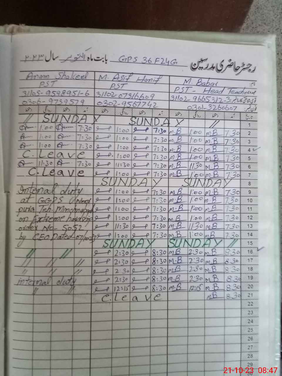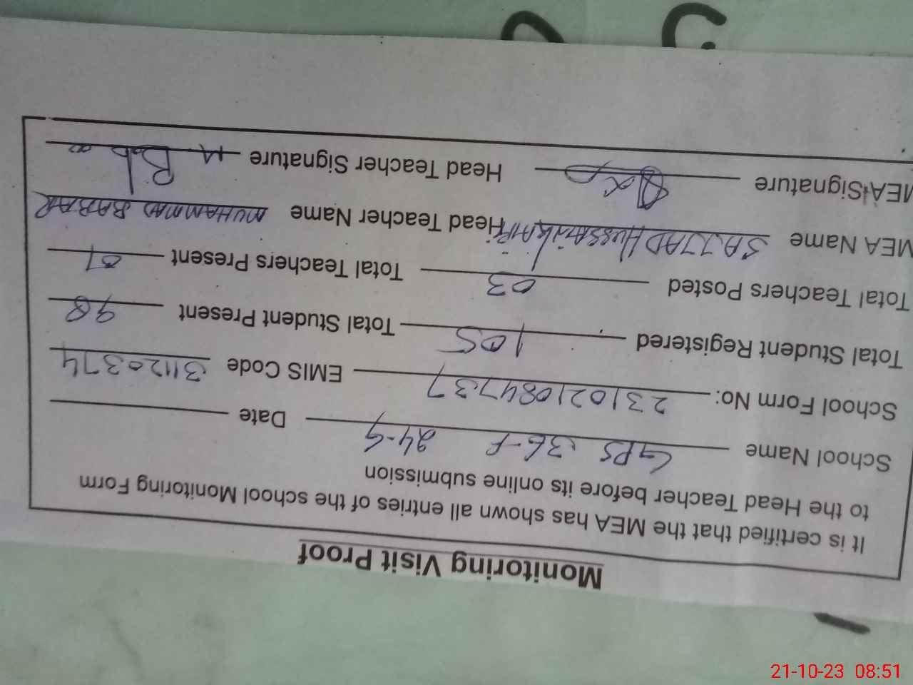 | Name: Mu**** Ba**** Designation: (School Headmaster's/Headmistress's) PST Phone/Cell Number: 03**** |