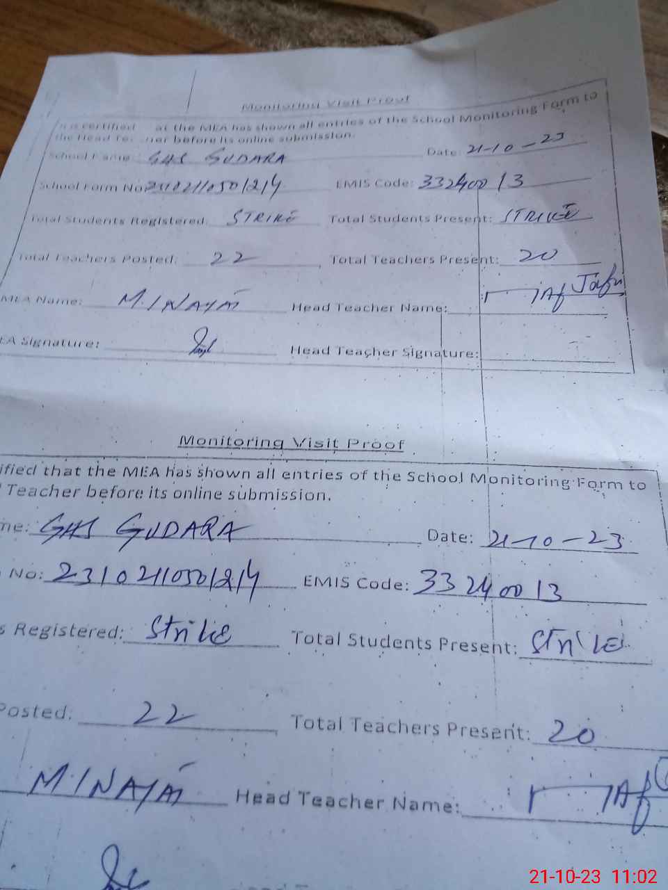 | Attendance Register | Head Teacher | MEA with School | Visit Proof |