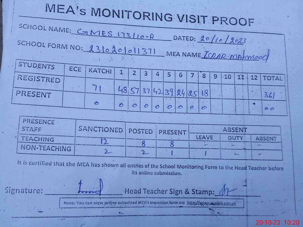| Attendance Register | Head Teacher | MEA with School | Visit Proof |