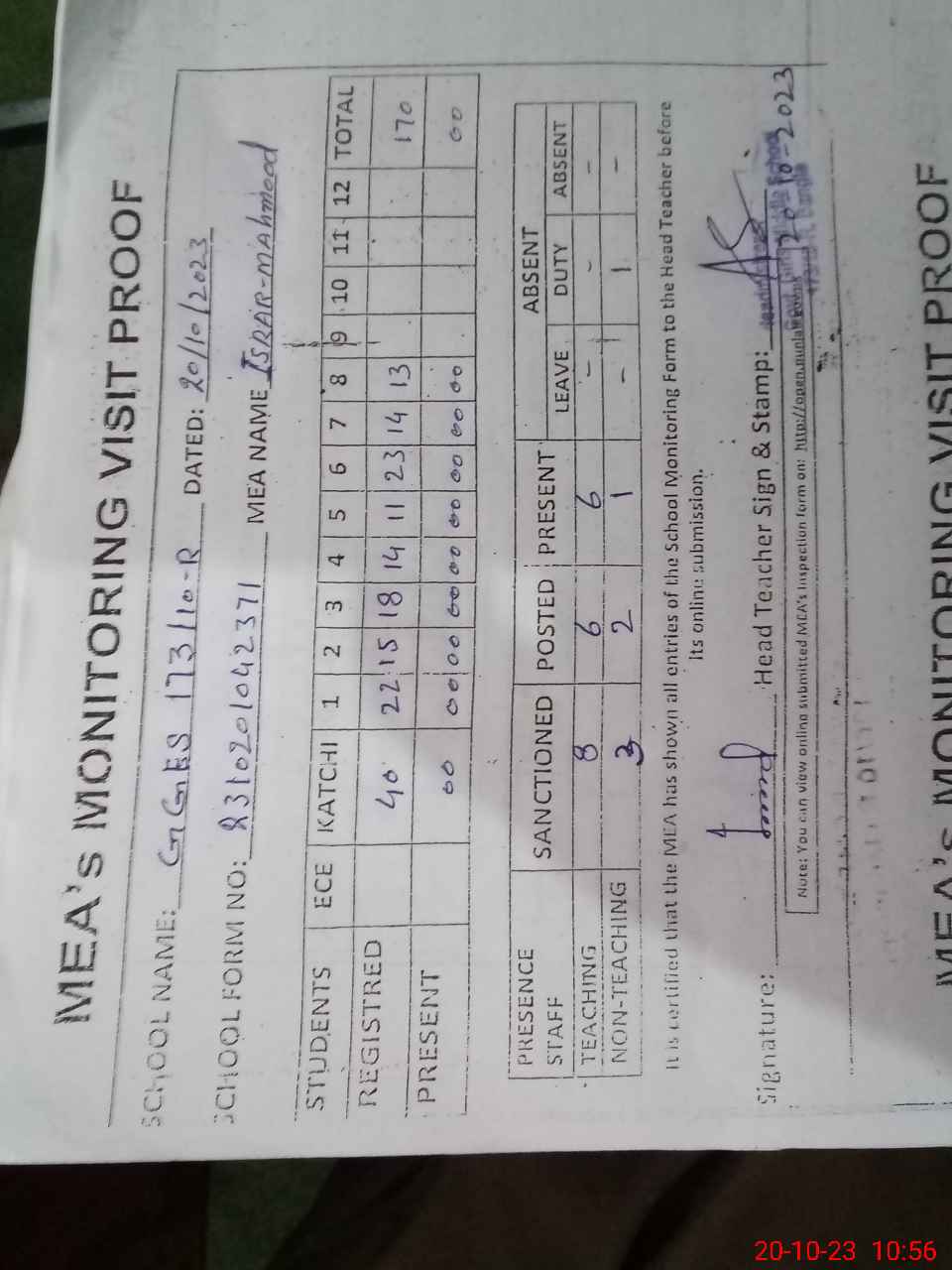 | Attendance Register | Head Teacher | MEA with School | Visit Proof |