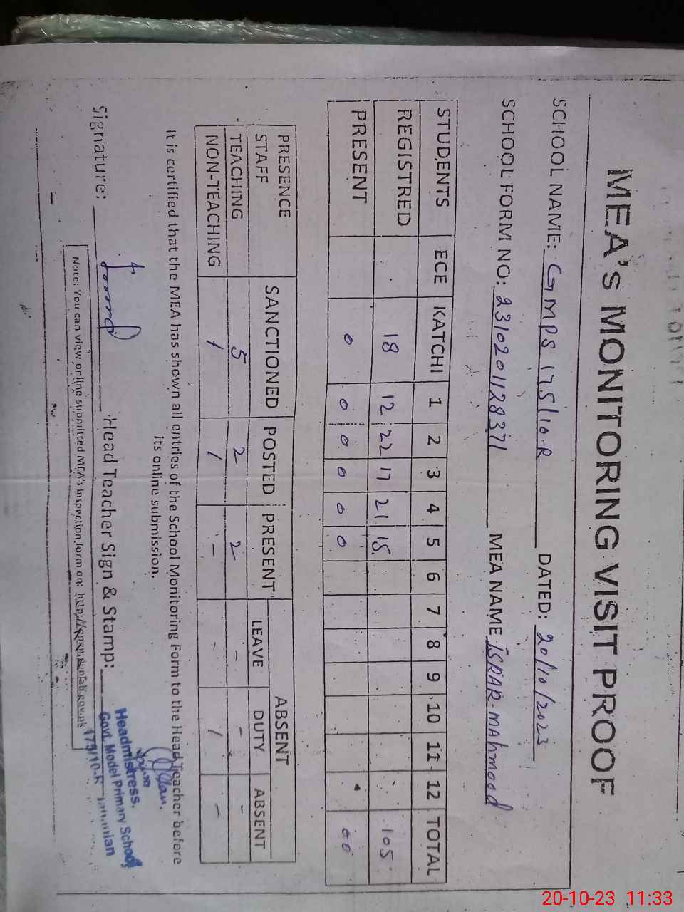 | Attendance Register | Head Teacher | MEA with School | Visit Proof |