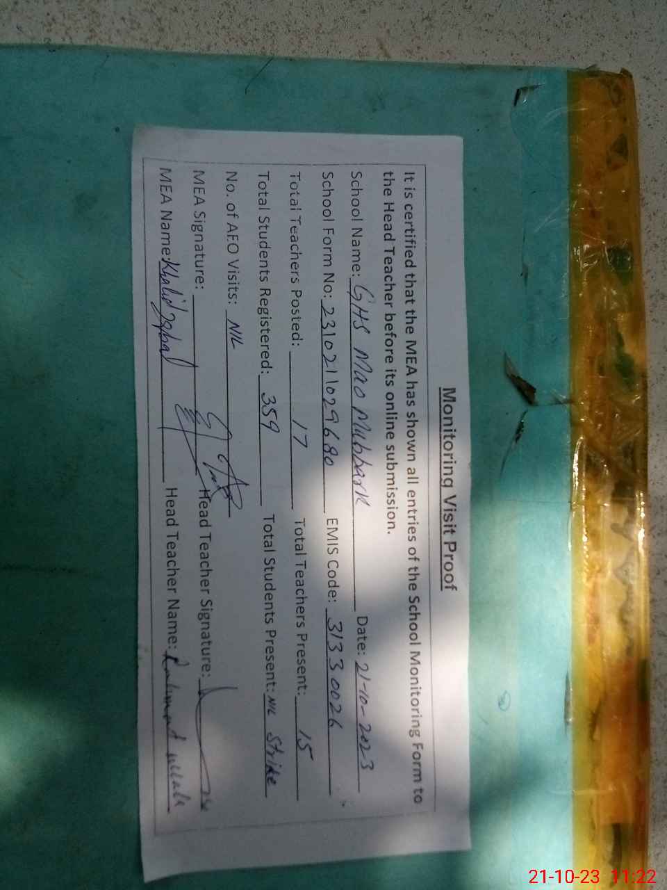 | Attendance Register | Head Teacher | MEA with School | Visit Proof |