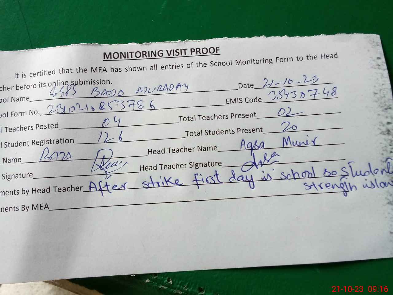 | Attendance Register | Head Teacher | MEA with School | Visit Proof |