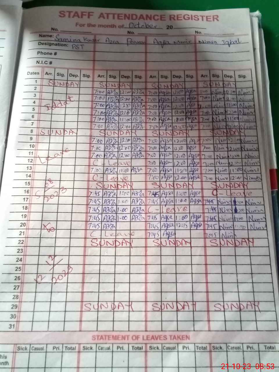 | CNIC | Full Name | Designation | R/C | Absence During Last Calender Month |