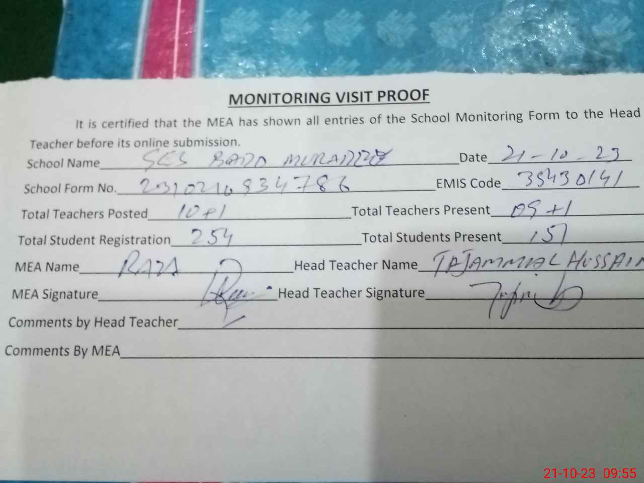 | Attendance Register | Head Teacher | MEA with School | Visit Proof |