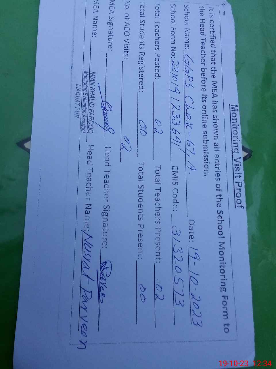 | EMIS Code: 31320573 | Name of School: GGPS CHAK 67/A JADEED | |||