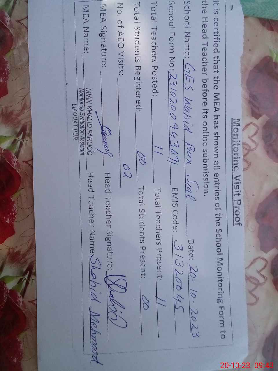 | EMIS Code: 31320045 | Name of School: GES WAHID BAKHSH SIAL | |||