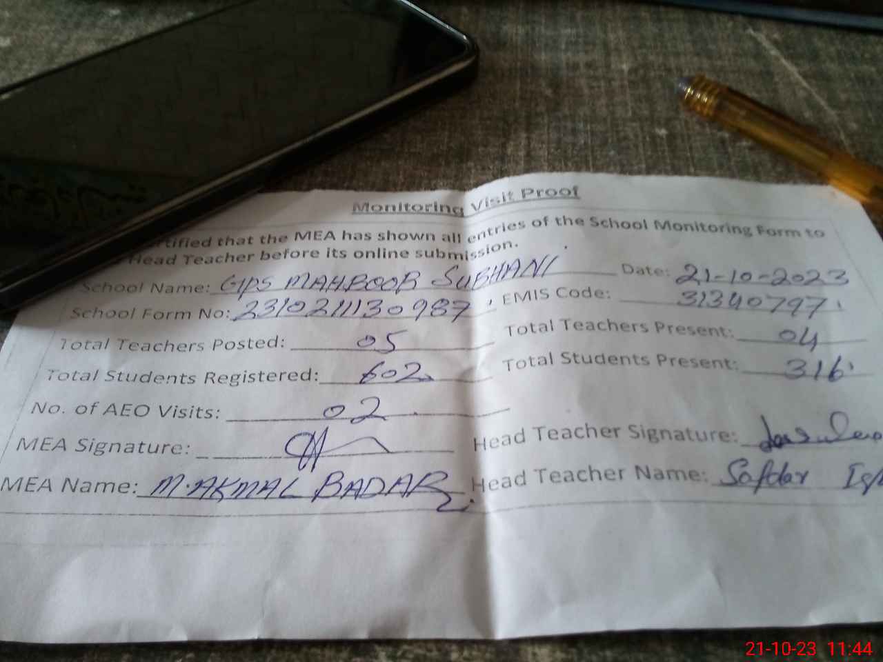 | Attendance Register | Head Teacher | MEA with School | Visit Proof |
