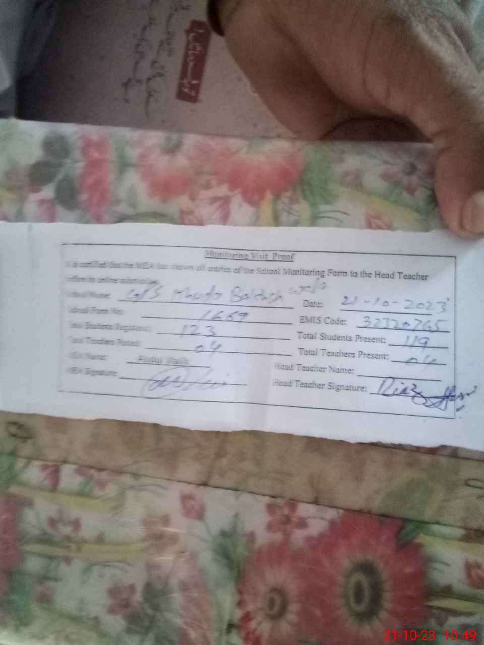 | Attendance Register | Head Teacher | MEA with School | Visit Proof |