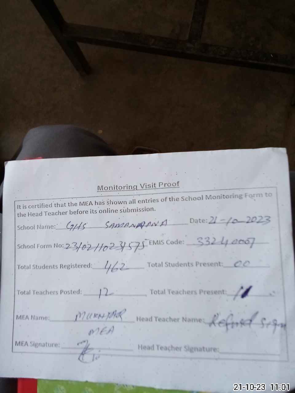 | Attendance Register | Head Teacher | MEA with School | Visit Proof |