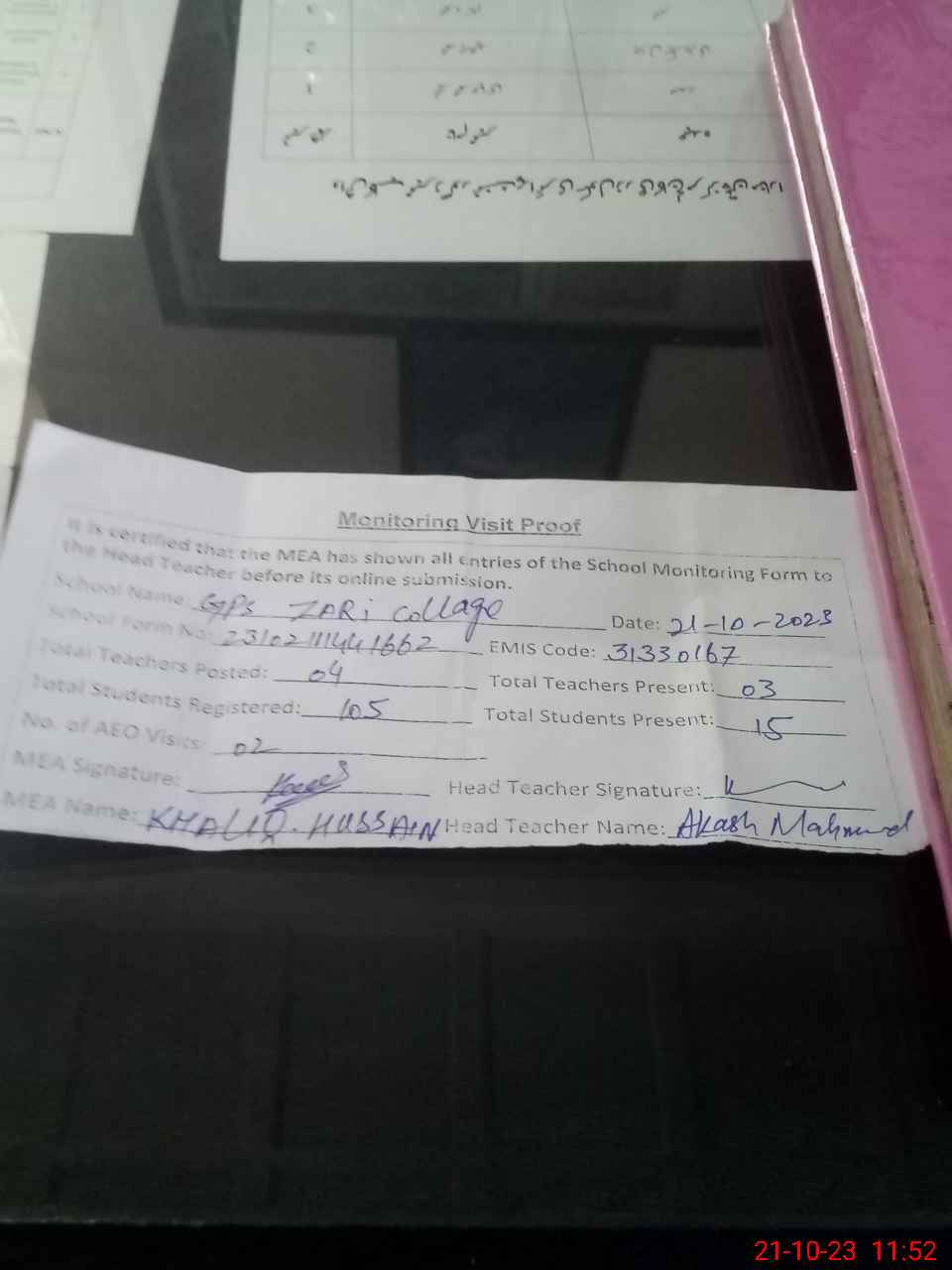 | Attendance Register | Head Teacher | MEA with School | Visit Proof |