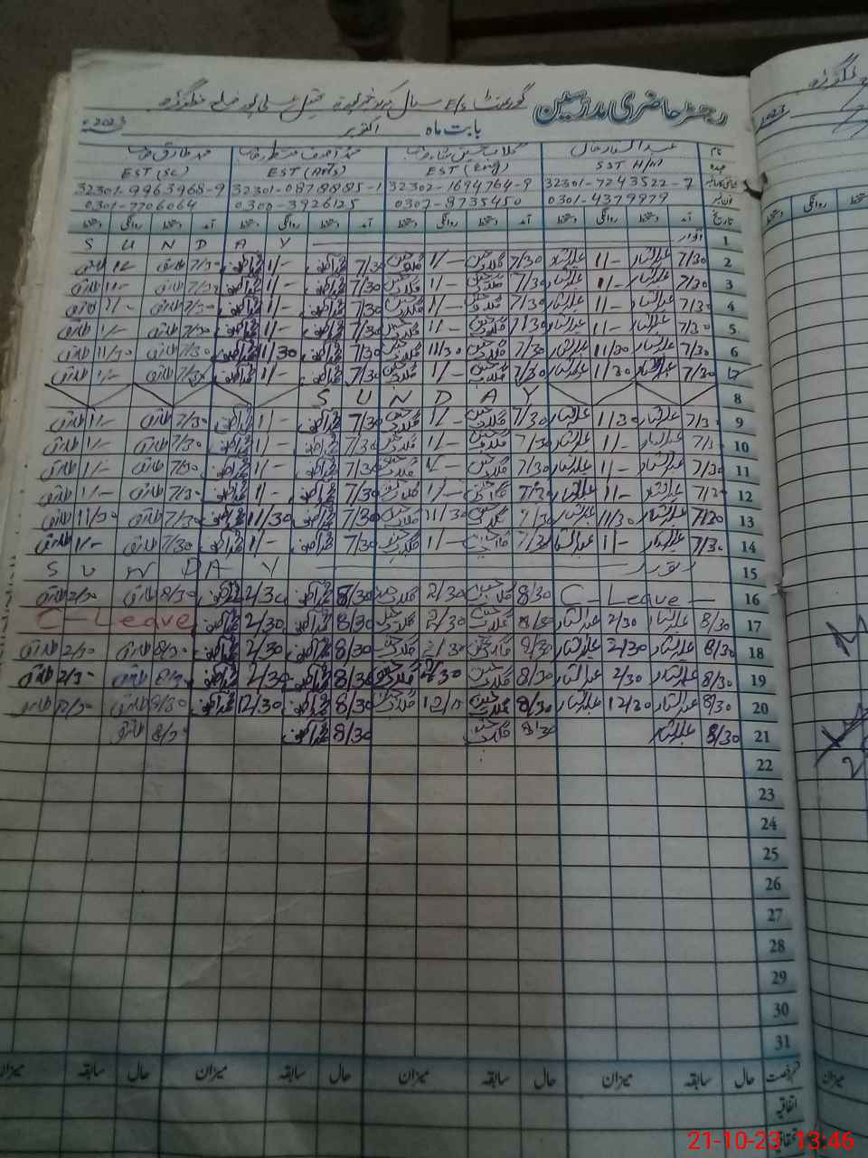 | CNIC | Full Name | Designation | R/C | Absence During Last Calender Month |