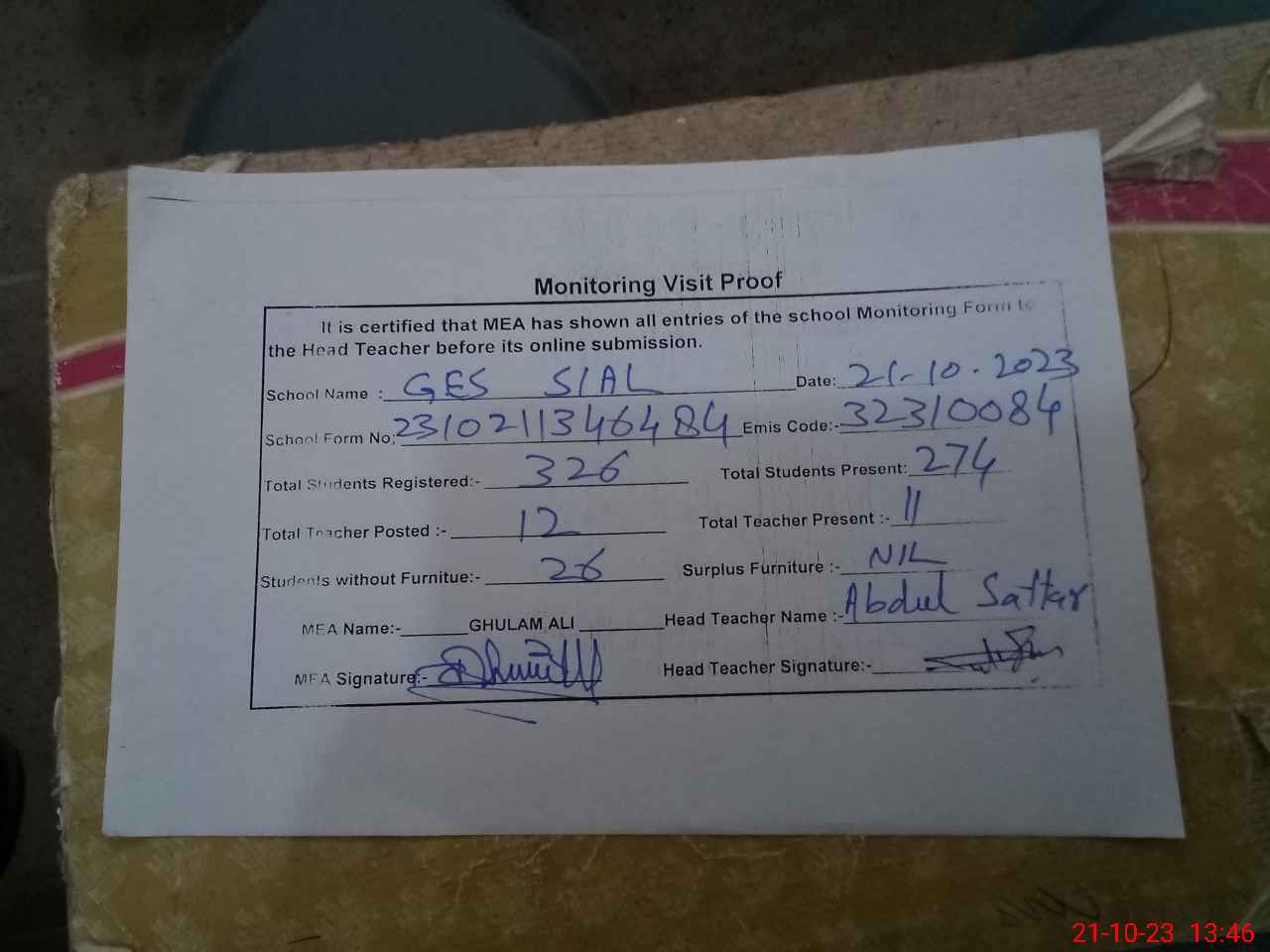 | Attendance Register | Head Teacher | MEA with School | Visit Proof |