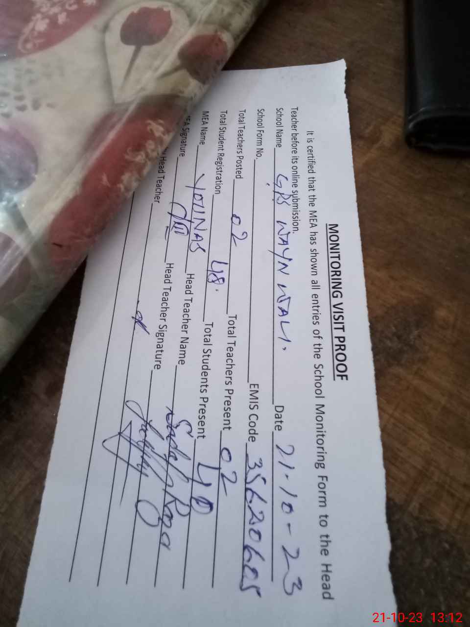 | Attendance Register | Head Teacher | MEA with School | Visit Proof |