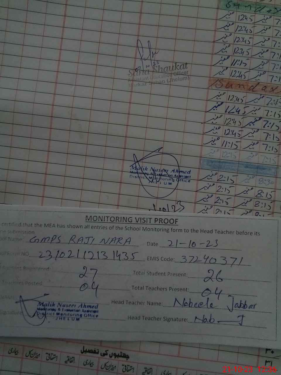 | Attendance Register | Head Teacher | MEA with School | Visit Proof |