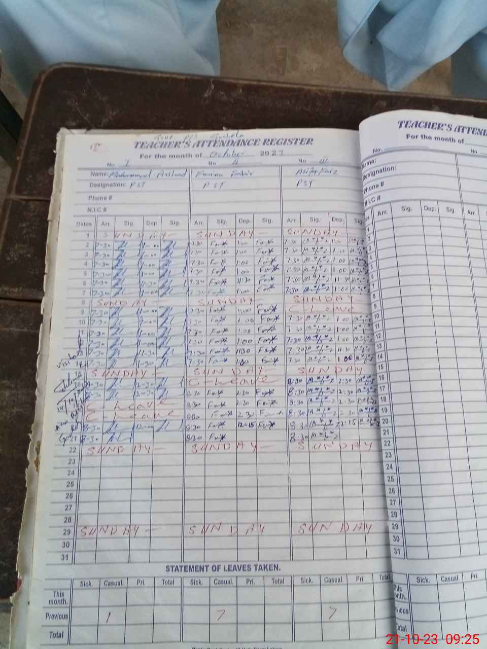 | CNIC | Full Name | Designation | R/C | Absence During Last Calender Month |