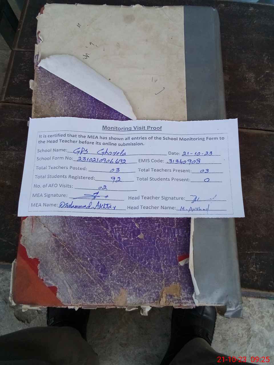 | Attendance Register | Head Teacher | MEA with School | Visit Proof |