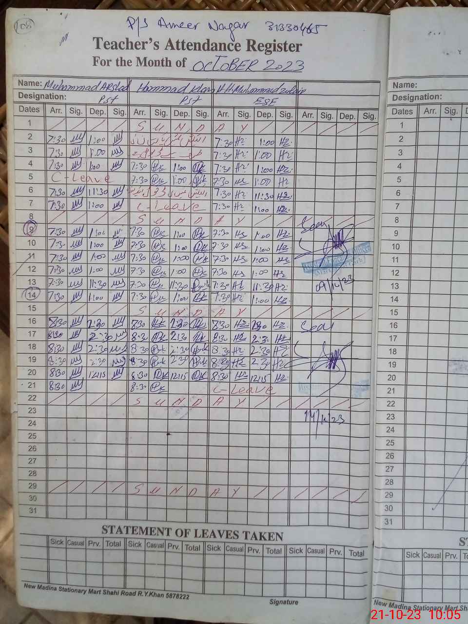 | Name: Mu**** Ar**** Designation: (School Headmaster's/Headmistress's) PST/PTC/JV Phone/Cell Number: 03**** |